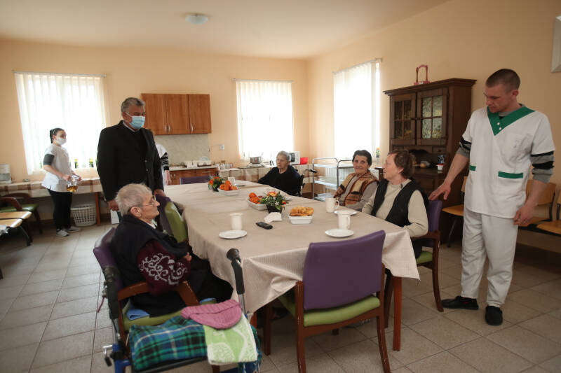 Tijdens één van onze bezoeken aan Dianne en het internaat in oktober 2011 kwam Nagy Béla, de directeur van de Diakonie van de Transcarpathian Reformed Church met zijn plan om een oud vervallen gebouw dat op zijn terrein stond, opnieuw op te bouwen en te bestemmen voor ouderen met Alzheimer. Op ditzelfde terrein stond al een bejaardentehuis en een opvanghuis voor alleenstaande moeders. In de Oekraïne worden mensen met dementie in de regel in een psychiatrische instelling gedropt wanneer ze niet meer in hun eigen woonomgeving of een bejaardentehuis zijn te handhaven. In samenwerking met Stichting Nederland voor Oekraïne zijn we begonnen aan deze omvangrijke klus. Er zijn tekeningen en een begroting gemaakt, afspraken gemaakt met Béla en de aannemer en in 2012 is men gestart met de bouw van het huis. In het huis is een kapel ingebouwd, wat het huis een christelijke identiteit geeft en waardoor de staat geen aanspraak kan maken op het gebouw. Iets wat anders zo maar zou kunnen gebeuren. Er zou op de bestaande fundering worden gebouwd, maar deze was zo slecht dat ook die vervangen moest worden. Na 5 jaar (in de Oekraïne gaat één en ander langzamer, véél langzamer en minder georganiseerd dan in Nederland) is het huis af. In de afgelopen jaren zijn er diverse bezoeken gebracht aan de Oekraïne, waarbij ook veel overleg is geweest over de voortgang van de bouw van het huis. Ook zijn er in de afgelopen jaren diverse transporten richting Beregovo gegaan met bedden, tafels, stoelen, kleding, lampen en wat er zoal aan spullen nodig is om een Alzheimerhuis in te richten. Wat er daarnaast nog nodig was, is in de Oekraïne aangeschaft. Tijdens ons bezoek in oktober 2016 is er geholpen met schoonmaken, zijn er diverse klussen geklaard en is er een lijst gemaakt met de laatste door te voeren aanpassingen. Het grootste struikelblok was het werven van personeel. Beregovo ligt tegen de Hongaarse grens aan en veel geschoolde mensen gaan in Hongarije werk zoeken, omdat de salarissen daar veel beter zijn.